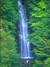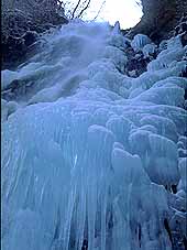 冬、氷結した「百尋の滝」を見るためには、凍った雪道を1時間程度歩くことを覚悟しなければならないが、実際、滝を目の当たりにすると、苦労しただけのことは味わえる。 |